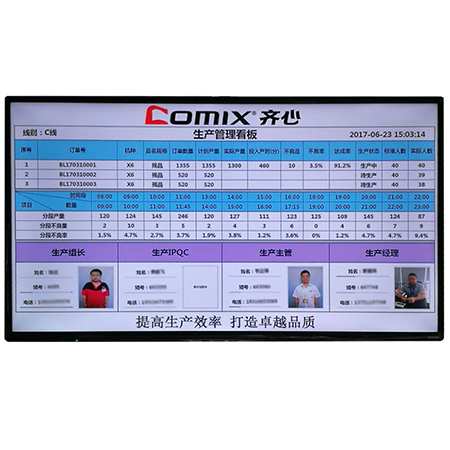 传统电子看板使用LED屏,显示数据少,内容单一,并且无法将多条产线组成网络,进行集中管理和数据存储。我司研发的液晶电子看板,采用高分辨率,显示内容丰富,色彩和布局可根据客户喜好进行设计,同时可通过以太网/无线网络将工厂内的所有电子看板进行集中管理,并且将实时的生产数据上传到服务器,管理人员在办公室就可以实时查看生产进度,返修率等数据。
