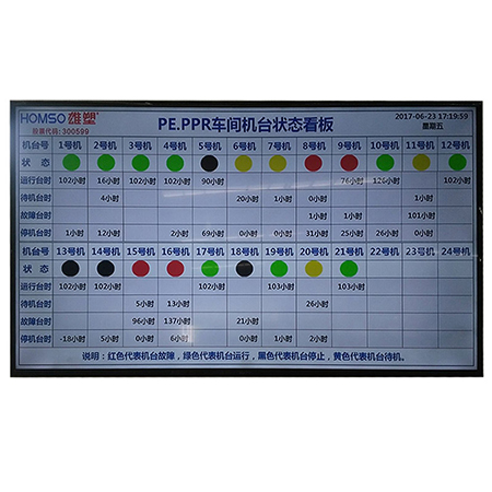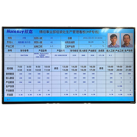 传统电子看板使用LED屏,显示数据少,内容单一,并且无法将多条产线组成网络,进行集中管理和数据存储。我司研发的液晶电子看板,采用高分辨率,显示内容丰富,色彩和布局可根据客户喜好进行设计,同时可通过以太网/无线网络将工厂内的所有电子看板进行集中管理,并且将实时的生产数据上传到服务器,管理人员在办公室就可以实时查看生产进度,返修率等数据。